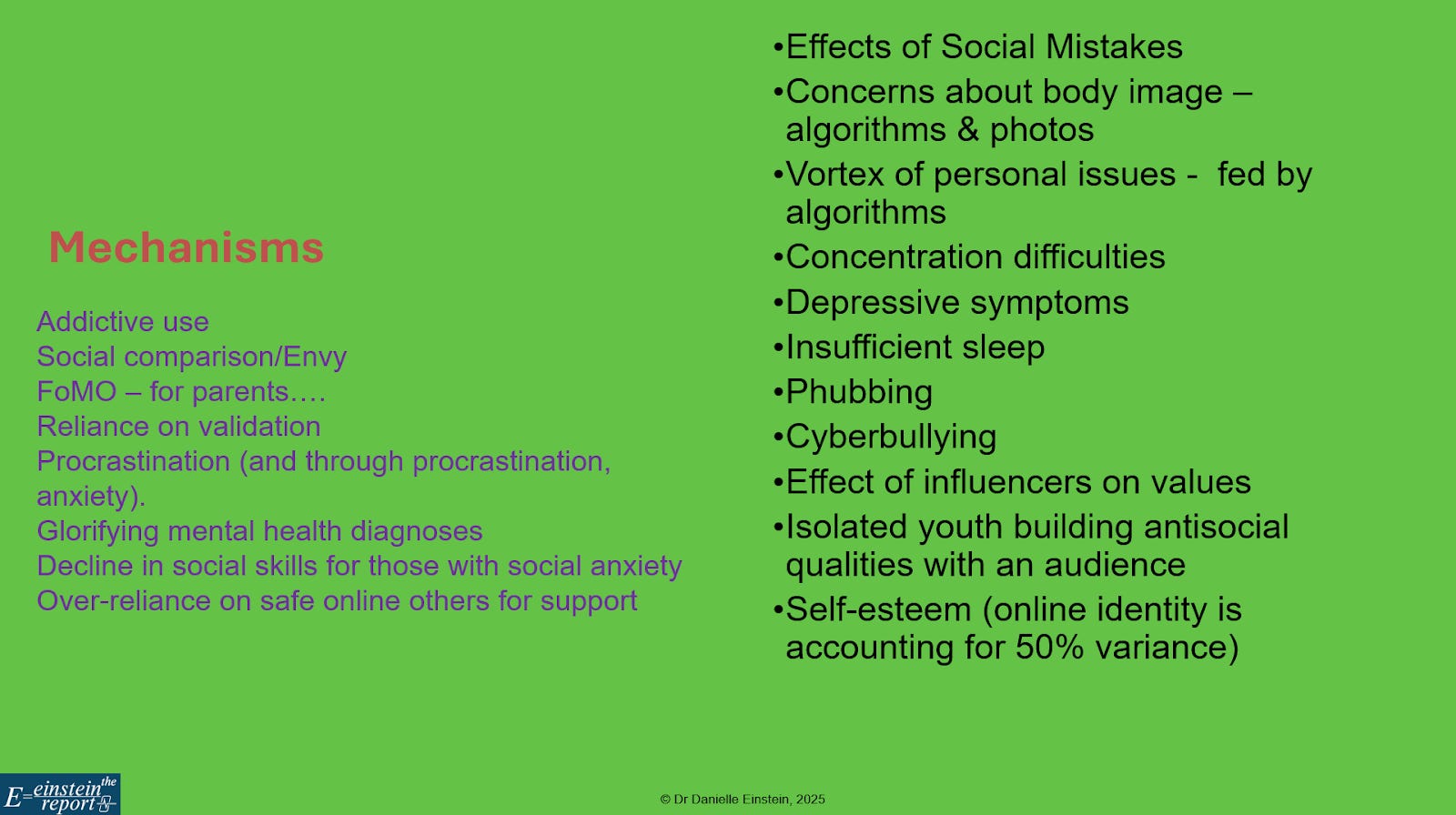 So here are just some of the mechanisms - I'm not going to go through them all but in my head I'm thinking and I'm seeing in my clinic all these things coming forward okay these are all the different concerns we've got about unregulated social media use and the mechanisms by which they're causing problems.