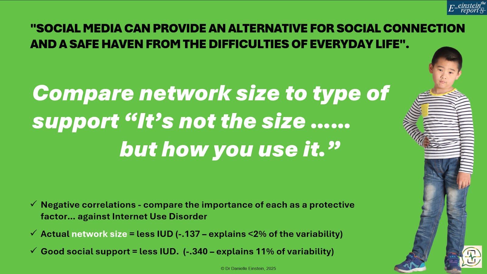 But here's the one that's the most confusing because this one says you have good social support you have less internet use disorder so that's been used as an argument to say look we can get more better social support online but when you look hard at this right that explains 11% of the variability but when you look hard at it good social support is using measures that ask people would your friends deliver you medicine at home if you're sick - that's not online social support that's meaning that there is an element of physical real connection and a lot of those questions are about real connection and authenticity of connection it's not requiring [the person] to be online.