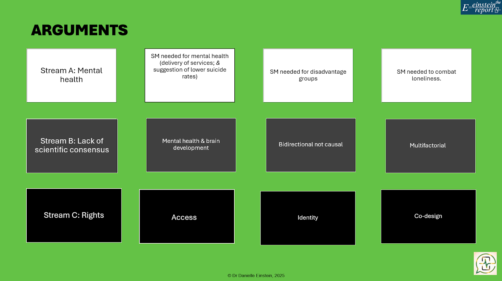 So I was on an expert round table for the age assurance committee and I had been reading through these submissions and I'm just going to stick with this mental health one [line of arguments from earlier argument slide] to start off with because I think suicide is a very important one when I saw the word suicide I thought oh my goodness if there's going to be more suicide that obviously means we can't do anything about social media you would not want to cut or put regulation on some sort of mechanism that prevents suicide right - that's very emotional that's very persuasive.