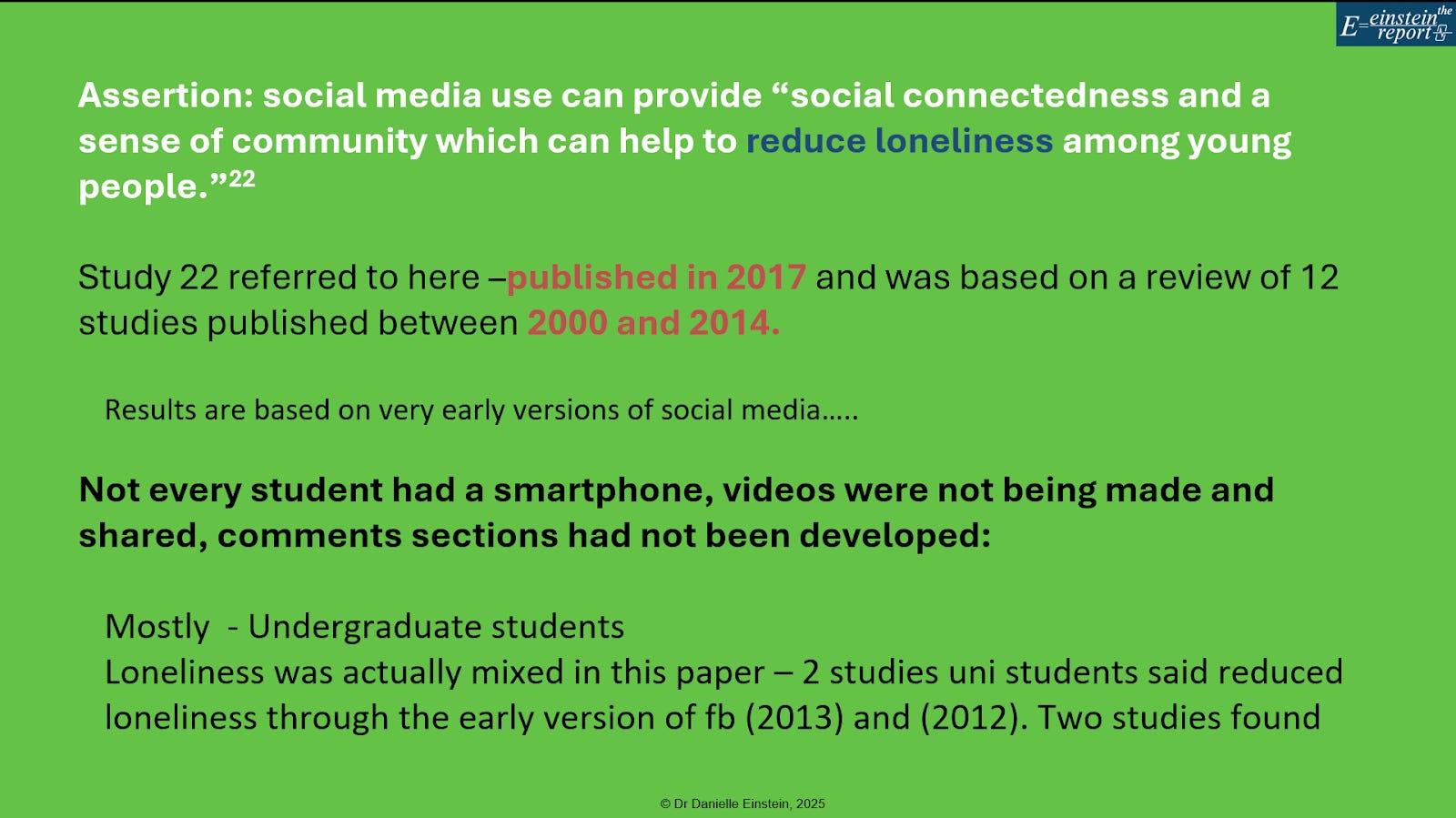 So now I had another look at one of those organisations and what they were saying about how it can be used to reduce loneliness and just to summarize very quickly they've used a review of 12 studies they were all published between 2000 and 2014 so again we're looking at the early use of social media - and [keep in mind] at that point I don't think in most of those studies social media wouldn't have even had necessarily comment sections underneath they certainly wouldn't have had the TikTokky kind of movies and as many of those like features and popularity contests that we now see as part of social media.