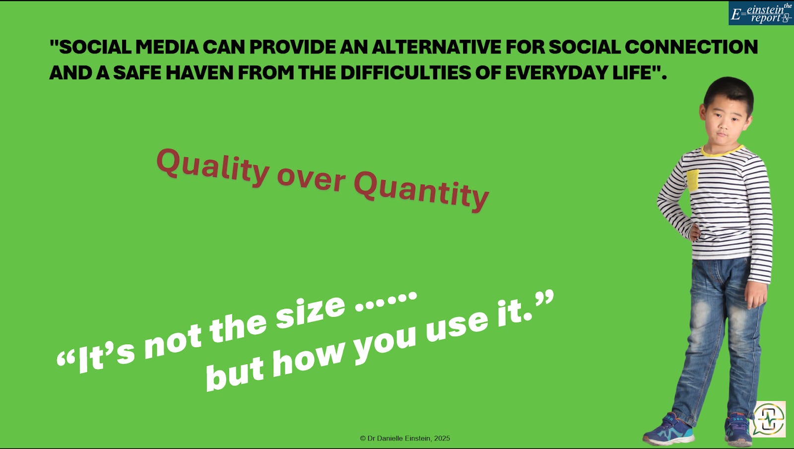 So this is one of the lines "Social media can provide an alternative for social connection and a safe haven from the difficulties of everyday life" okay keep in mind we've just talked about how so many of the current difficulties of everyday life for kids at school are coming through social media and would not be there if we didn't have it and if you look at what happened when we brought phone bans in if anyone's any question about that to schools if you look carefully at the studies there's a study in Norway that's come out showing that there's less need for psychological care once the phone bans came in we're also seeing less bullying and we're seeing benefits academic benefits for socioeconomically disadvantaged girls