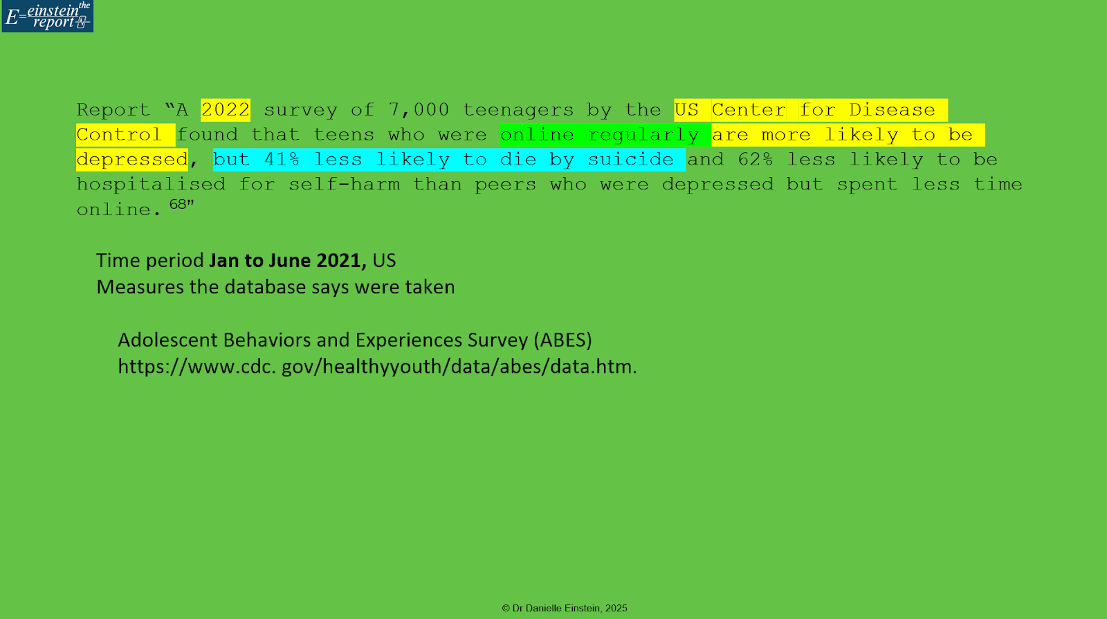 So I said “I can't work this out because it says more people died and I don't know how they measured that they were dead because they're asking questions that they had to complete a survey first off but as you can see here here's the statement in the report - A 2022 survey of 7,000 teenagers by the US Center for Disease Control found that teens who are online regularly are more likely to be depressed" okay well that's a problem right first off but let's ignore that because then it says "but 41% less likely to die by suicide" it says that so they've died according to this - 41% less likely to die and 62% likely to have a serious self harm episode okay than people who are depressed but who are spending less time online or more time online I think it should say.