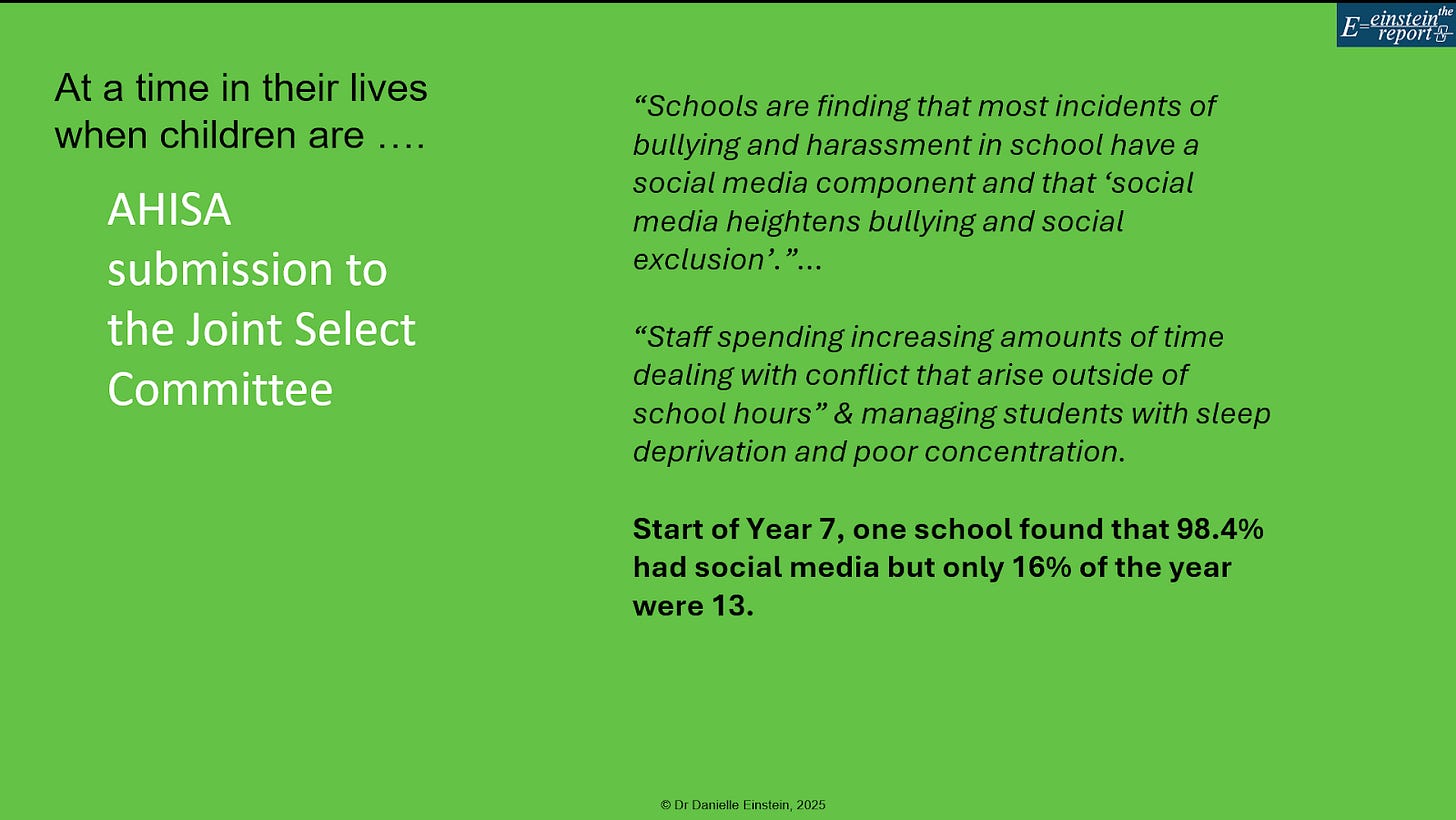 So as part of this I'm reading through these submissions and one important one matches with what I'm learning at schools. I want you to think about when a child's in year seven or year eight, so before they're 16 - they are going into secondary school they are still needing to make friends they're having trouble they're worried about fitting in. It's normal for friendships to change. They don't necessarily have good strong social groups - they very quickly get jealous of one another, upset that one friend might go to another friend. They are very easily mean to each other in just subtle ways in a group, just in a group chat even forget all the algorithms.