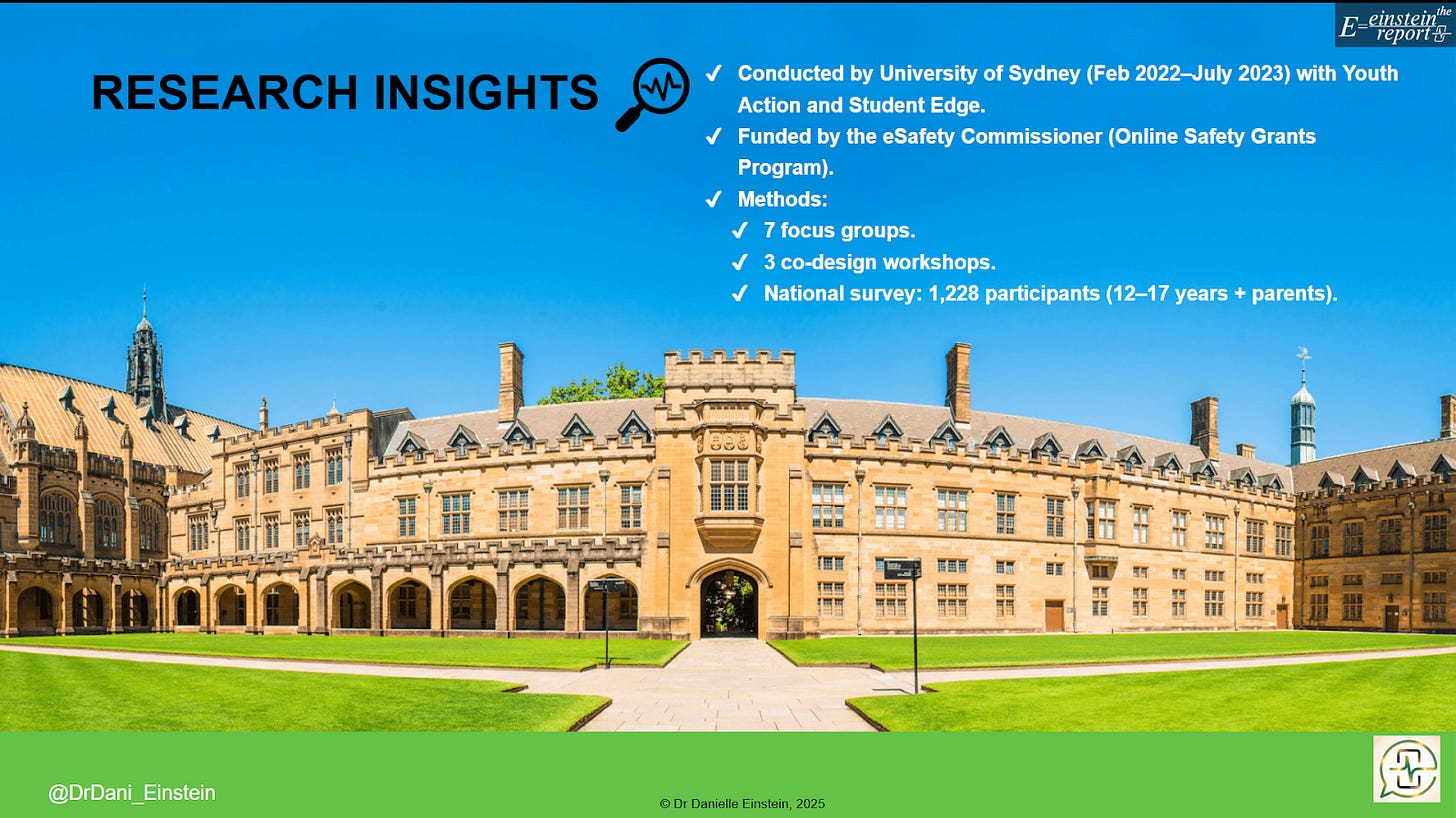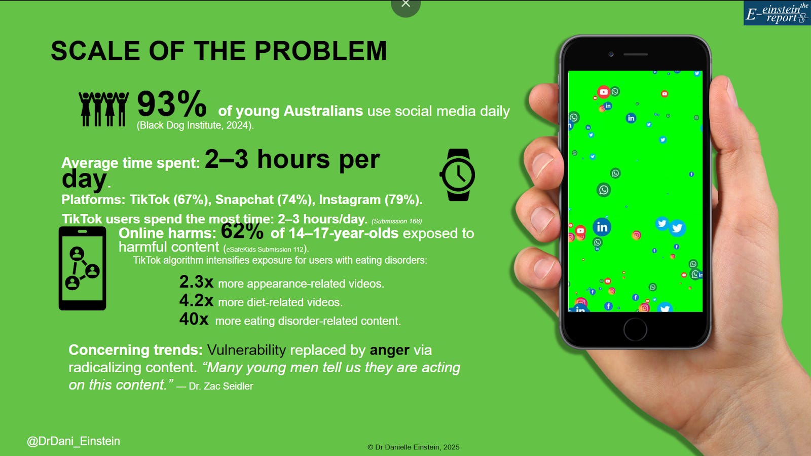 In this seminar, I present compelling evidence about the impact of unregulated social media use on youth. It is particularly valuable for educators, mental health professionals, parents, and policymakers seeking evidence-based perspectives on digital wellness and the rationale behind Australia's groundbreaking social media legislation. I advocate for a multi-layered approach including age restrictions (particularly under-16), platform accountability, parent education, and healthcare provider awareness.