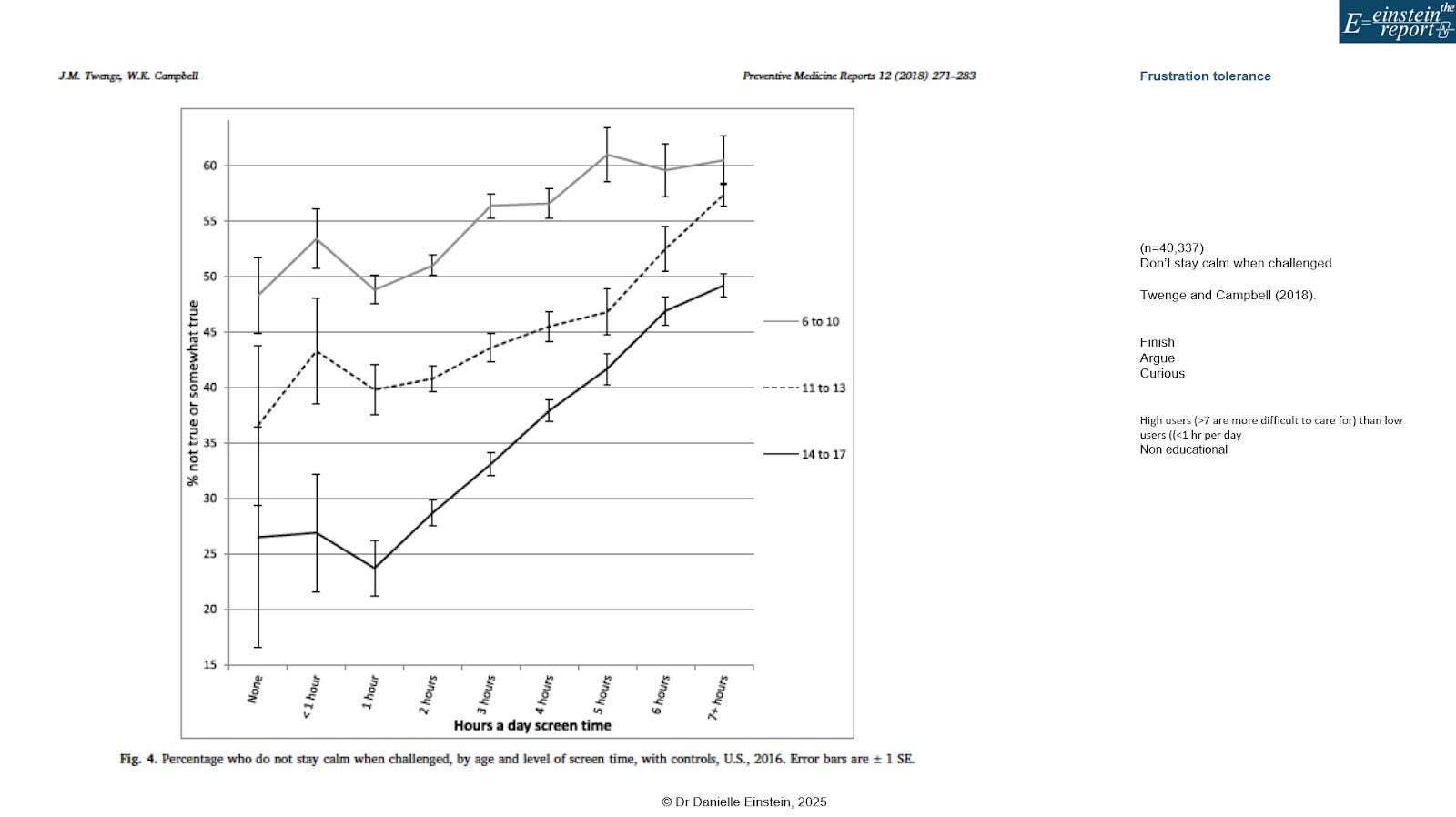 And Jean Twenge what she actually showed in one of her early studies was this - This is the three groups right, 11 to 13 year olds is the dash line; 6 to 10 is the straight line; 14 to 17 year olds is the heavier line and what she found when she asked caregivers with Dr Campbell was that children the more screen time the are on the less likely they are to be able to calm themselves down, to be able to finish a task, to be curious about the world like ‘actual curiosity’ and the more arguments they had i.e. the more difficult they were for caregivers.