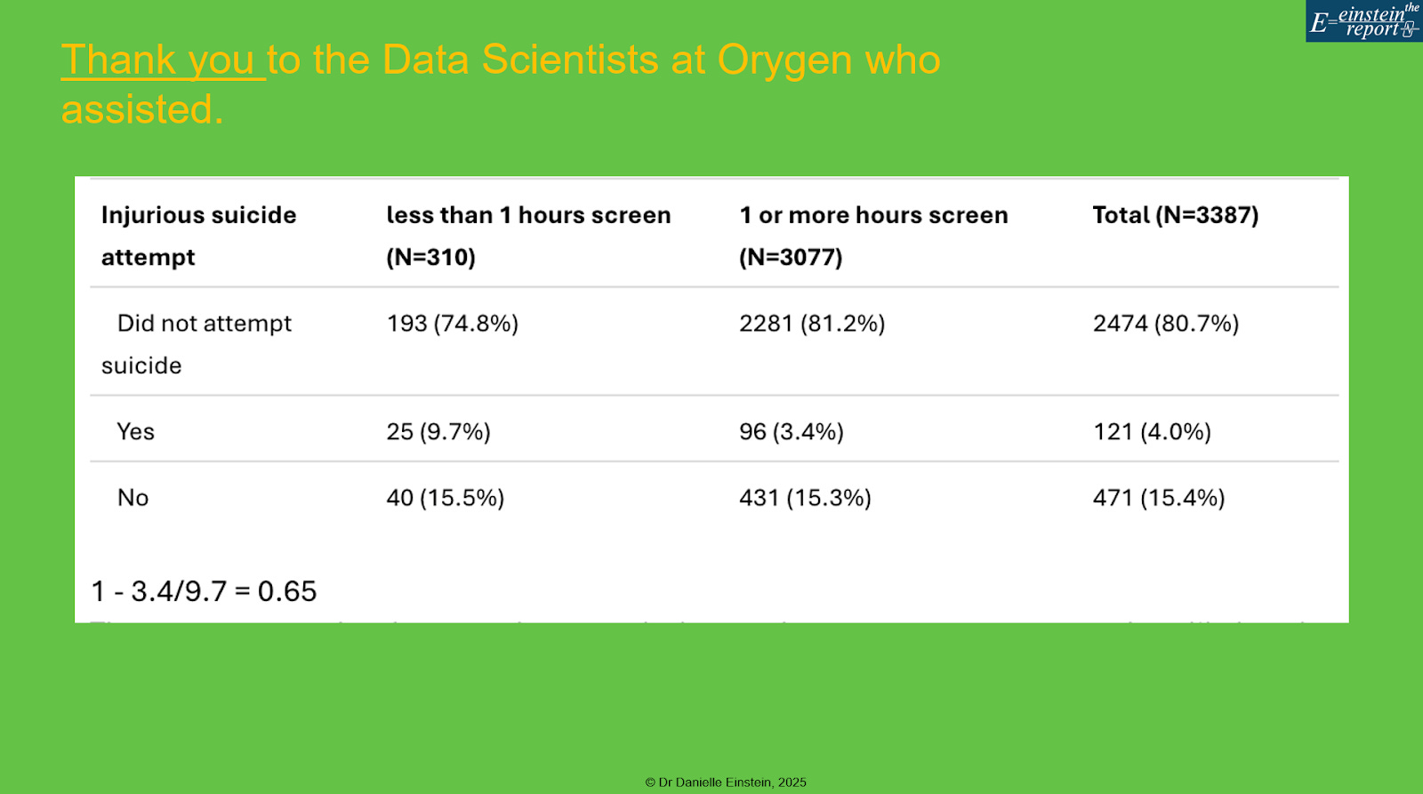 Here is the data okay so if we go back right and look at this this is a [relative risk table -slight error corrected from describing it as a probabilities table] of the kids who are depressed this adds up to 100% this adds up to 100%; and so does that so the argument is that these people that 9.7% here is 65% more likely than this one they've used the cut off as one hour or more on screen to say that if you were using less than one hour on a screen and this is outside of the school day right; that then you're more likely to have an injurious self harm episode.