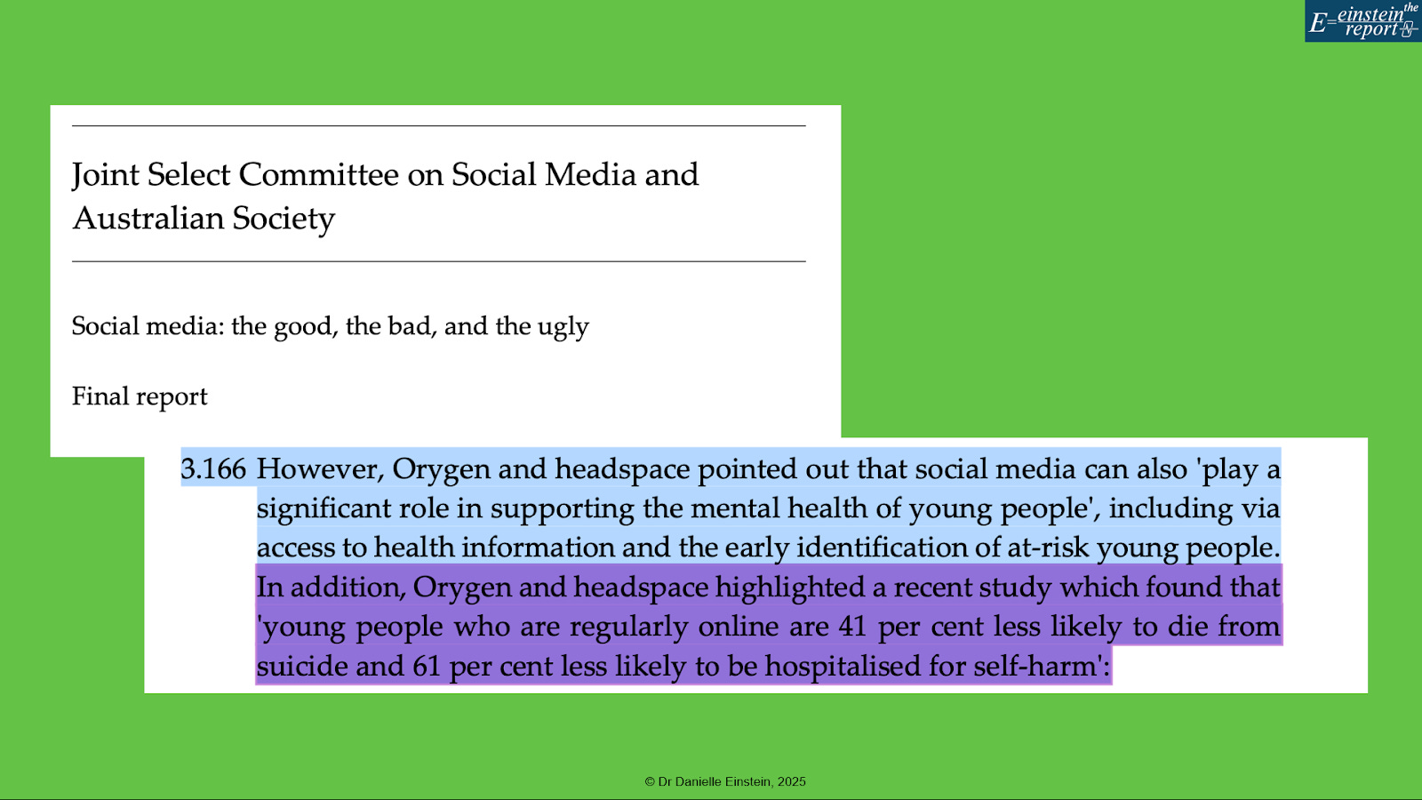 So I was on this age assurance round table and I said I can't work it out because I've seen this statement that's sitting in many of the submissions to the government from the mental health organisations and when I trace it back to the data (because I'm always going back to the data) what did they ask? what did they find? can they conclude what they say they found right?