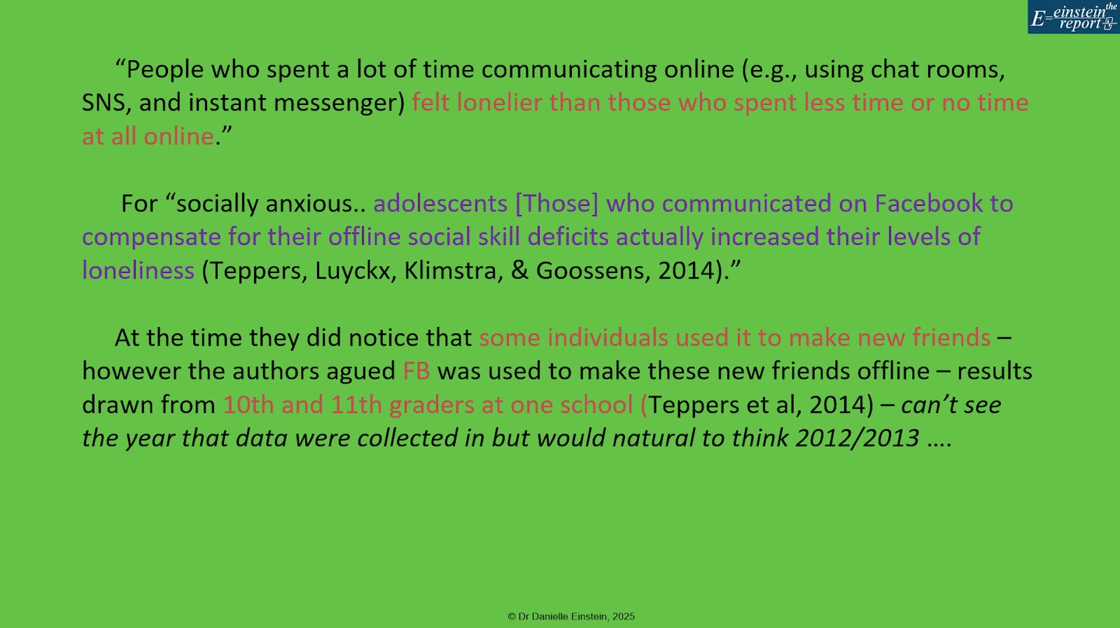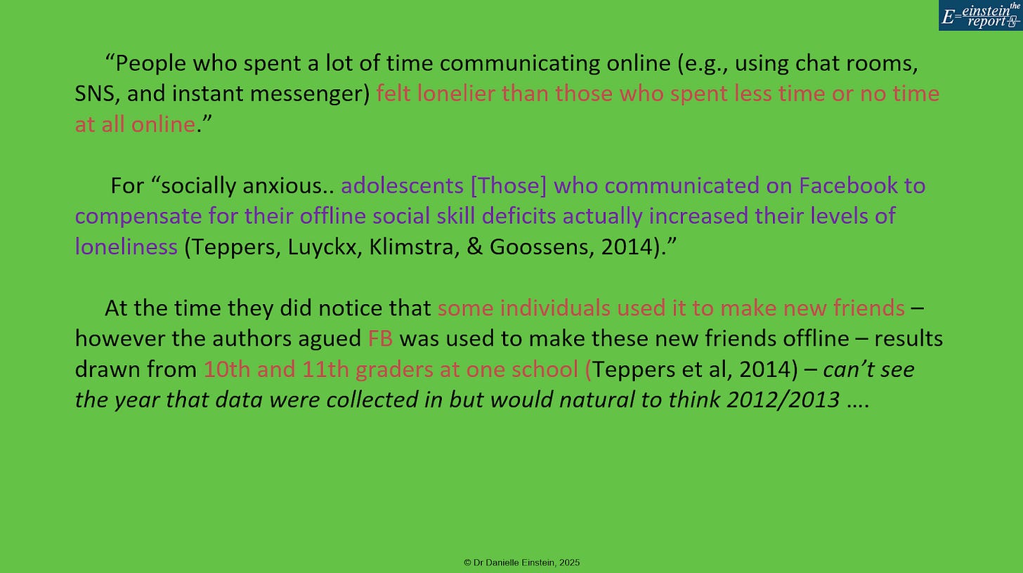 Now mostly those studies were done on undergraduate students and basically loneliness was mixed in one in that paper there were two which said it reduced loneliness through the early versions of Facebook but that happened when those same students also said they increased their face to face, so they use the Facebook to increase their social connections in real life and when you actually look at the ones where they're just what happened there okay and then when you just look at the ones that were spending a lot of time on the chat rooms they actually felt lonelier than those who were spending less time at all online.