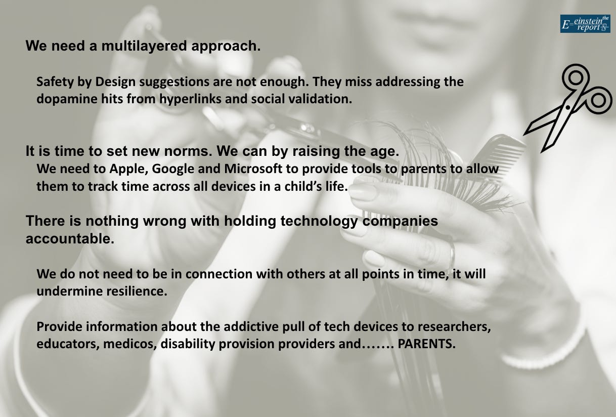 Dr. Einstein's Response: When I talk with parents about what's going on that's sort of more the style. This is a very research-oriented talk for you - to understand what's going on because I think the issue I'm wanting to convey to people - and like Warren said at the beginning overseas they were saying there was no psychologist and no researcher here that was supportive of this and I think the reason they're saying that [about my work] is because well - I don't quite understand it myself because I cannot understand why anyone would not want social media platforms to have a bit of skin in the game and why we would want misinformation to be out there.