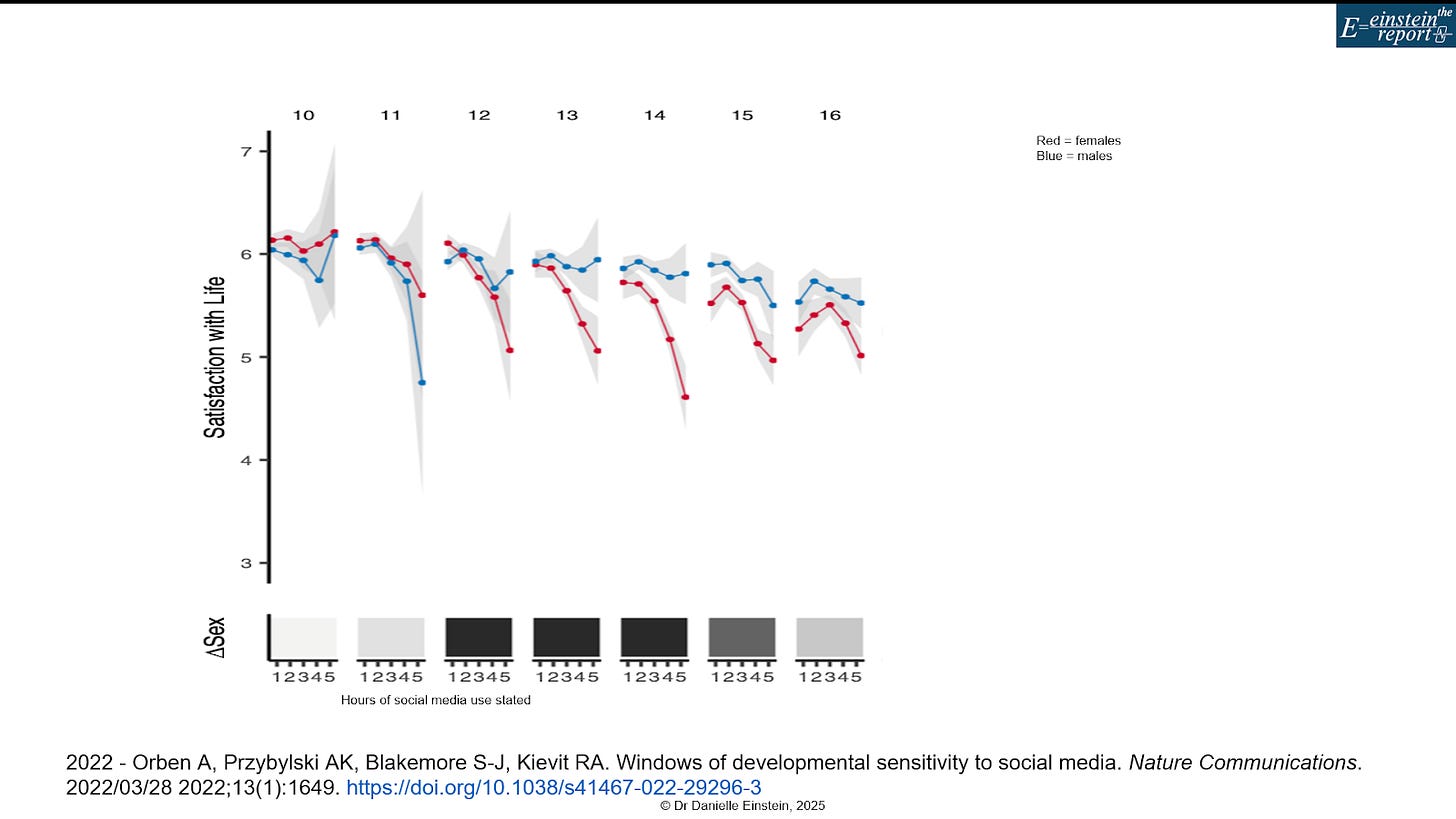 This is one of Amy Orben's other studies which I think is really interesting because one of the findings that we have and this was with a massive population it is cross-sectional data but she's got another section in it that's longitudinal as well - what it shows is that for girls there's no benefit of social media at all until they're 16 they don't feel better in their life they don't feel better in their satisfaction with their schoolwork and they don't feel better in their appearance their satisfaction with appearance until they're 16.